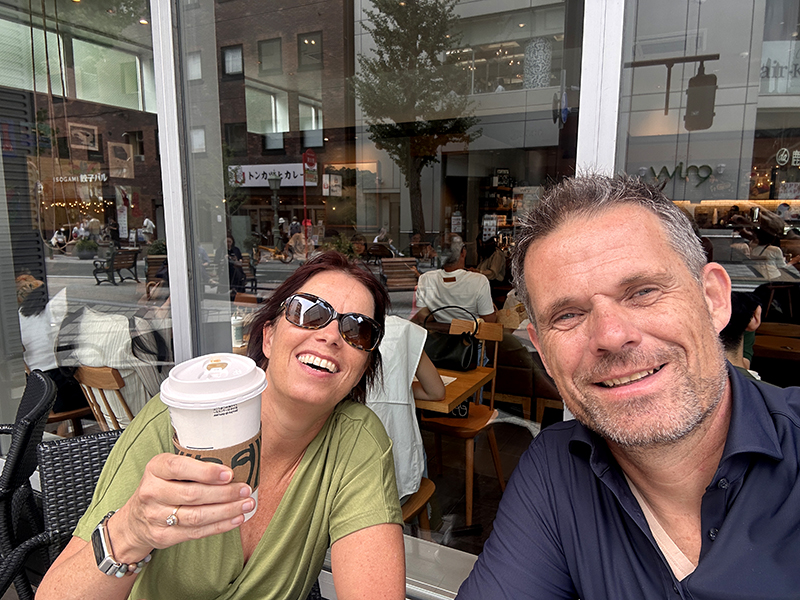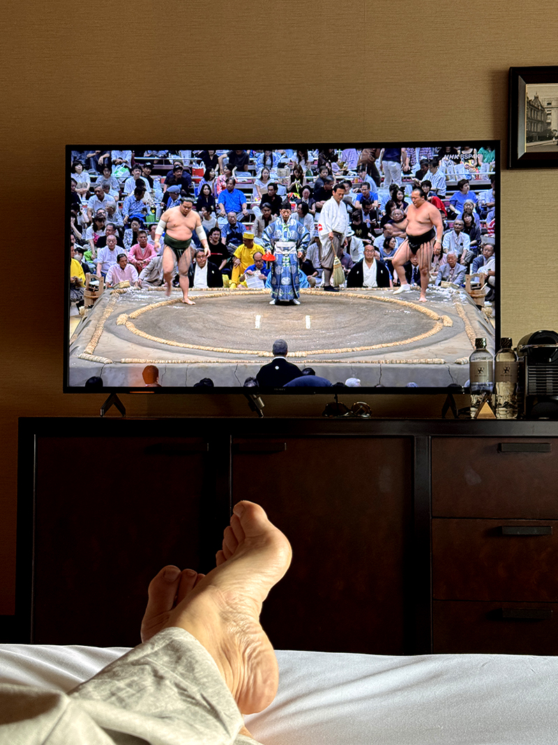 Na het inchecken, chillen we even op de kamer met op de tv Sumo worstelen, heel grappig om te kijken. Als we nu de nieuwste Airpods hadden van Apple, konden we live vertalen wat er gezegd wordt, maar nu hebben we geen idee. Gelukkig staan bij veel dingen ook de Engelse tekst. Niet zoals toen mijn ouders hier in 1977 aankwamen en echt alles alleen in het Japans stond. Geen touw aan vast te knopen en dus ook moeilijk om op pad te gaan. Zeker toen we nog even in Tokyo in een hotel moesten zitten, voordat we naar een huis in Yokohama verhuisden.