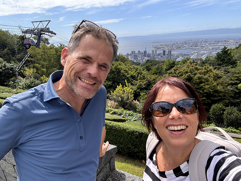We ontbijten vanmorgen in het hotel en lopen rond 11 uur de stad in. Het was gisteren best aangenaam, vandaag wordt het denk ik wel wat warmer. We besluiten om richting de kabelbaan naar een enorme kruidentuin te lopen. Dit is één van de attracties hier in Kobe. Het is niet moeilijk om de weg te vinden, Google Maps helpt natuurlijk, maar overal staan ook duidelijk bordjes. We lopen langzaamaan berg op. Het is opvallend hoe de stad duidelijk stopt bij de bergen, die blijkbaar zo grillig van vorm en steil zijn dat daar bouwen geen optie is. Ik had ook al in een podcast over Japan gehoord, dat een groot deel van Japan heel bergachtig is en je daardoor ook zulke grote concentraties van bebouwing hebt en de huizen ook vrij dicht op elkaar staan. We moeten flink omhoog klimmen via schattige straatjes en drinken koffie bij een heel klein cafeetje met een terrasje dat uitkijkt op de straat. We zien hier ook veel Japanse toeristen lopen. De meeste Japanners hebben zo’n 20 vakantiedagen per jaar, maar schijnen vaak maar de helft op te nemen. Vanuit de overheid is er een campagne om mensen te stimuleren meer vakantiedagen op te nemen.