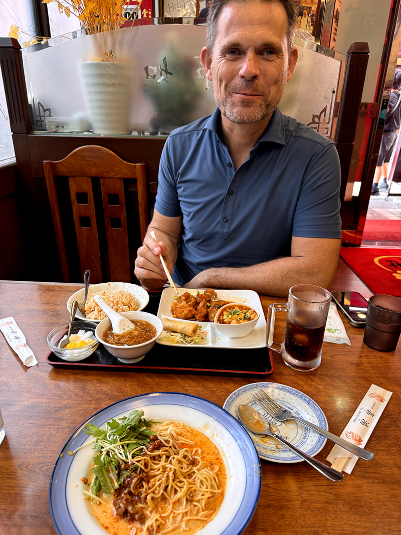 Het uitzicht boven over de stad is prachtig en de tuinen ook heel mooi. Wel een beetje gek om bovenaan de kabelbaan bij een gebouw aan te komen dat zo uit Duitsland is geïmporteerd en waar je worstenbroodjes, friet en bier kan krijgen! Deze stonden overigens niet op de posters beneden haha! Het is ook wel weer een beetje stereotype om te denken dat iedereen hier altijd Japans eten eet! Ze hebben natuurlijk ook gewoon zin in Indiaas, Italiaans of in dit geval Duits. We lopen via de tuinen (beetje parkachtig) een stuk terug naar beneden. Ondanks de mooie eetfoto’s, hebben we niet genoeg honger om hier wat te eten en we pakken op een tussenstation de kabelbaan weer terug naar de stad. Als we beneden zijn, is het bijna drie uur en nu moeten we wel echt wat eten. Door het tijdsverschil heb je nog niet veel trek rond de lunch, maar we raken zo een beetje te veel uit sync met het ritme hier (de meeste Japanners lunchen tussen 12 en 13). Veel lunchtentjes gaan om 3 uur dicht. Via de metro komen we weer in de buurt van ons hotel en na een stukje lopen op zoek naar iets, komen we toch weer uit in Chinatown. We duiken één van de eerste kleine tentjes in die open is. Ik neem koude noodles met iets van pindasaus en Thom krijgt een lunch met allemaal verschillende bakjes. Erg lekker allebei!